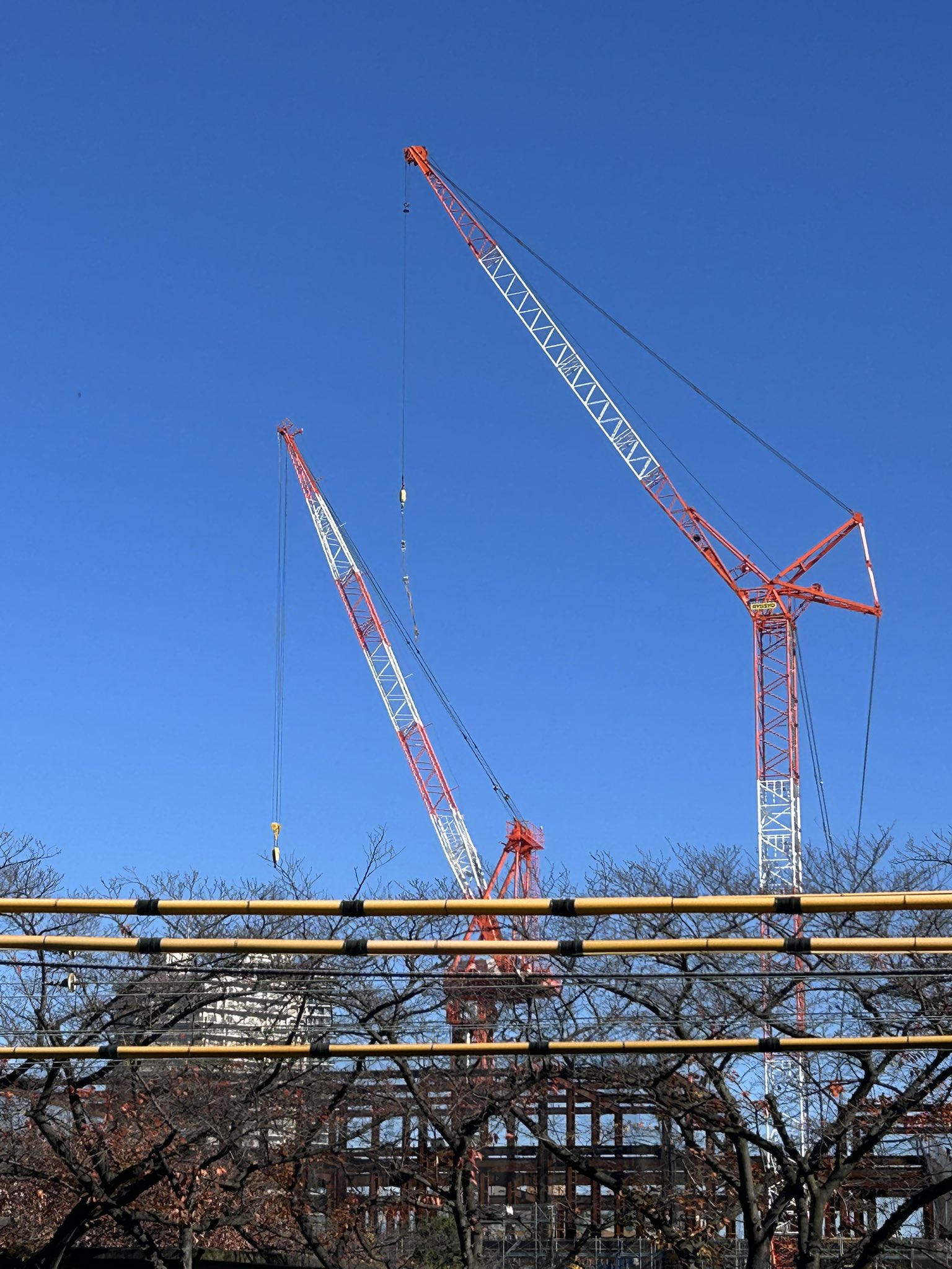 寒いのは嫌ですが、この時期の空の色は好きです。この間も散歩していたら抜けるような青空。またそこに堂々とそびえるクレーンがなんとも美しく、思わず写真を撮りました。電線も五線のようです。